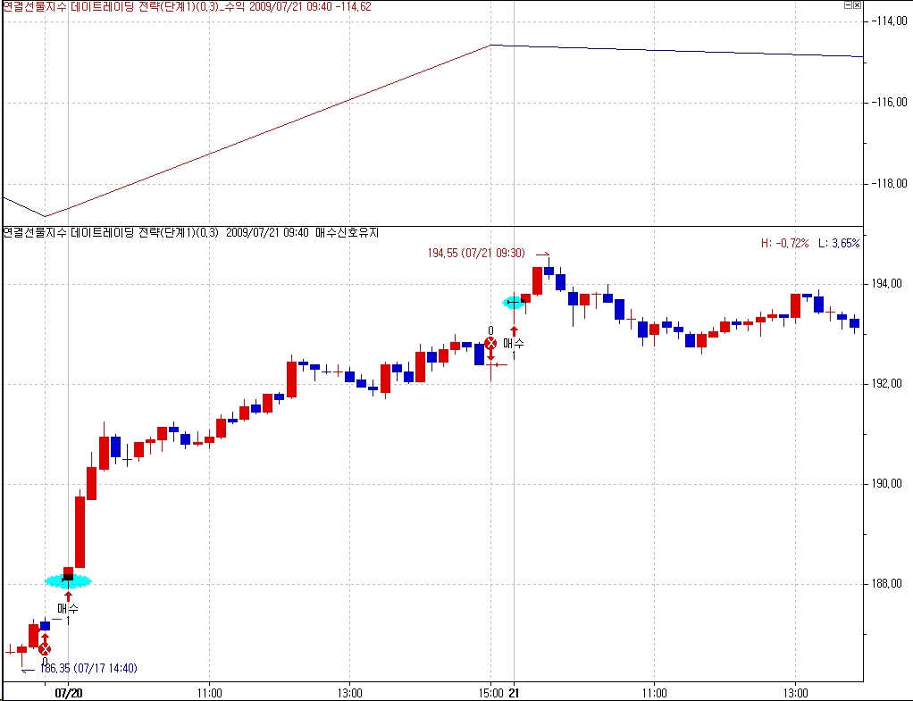 > 7감각시스템트레이딩 책에서 range를 이용한 매매식이 있어 예스트레이드에 적용했는데 신호가 의도와는 다르게 나오는 군요.