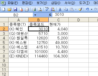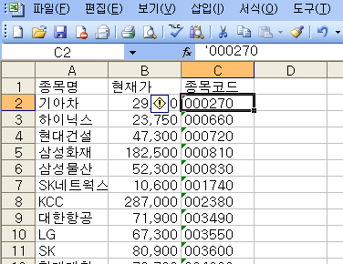 종목코드 6자리 중에 앞쪽의 "0"이 생략되어 내보내기가 이루어 지네요.