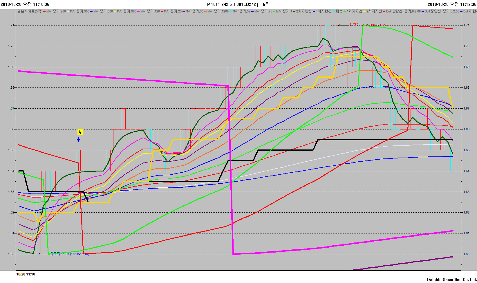 화살표 A봉 의 경우 Psar2(0)는 값이 약 1.644 정도이고 A봉에서 고가는 1.65입니다.