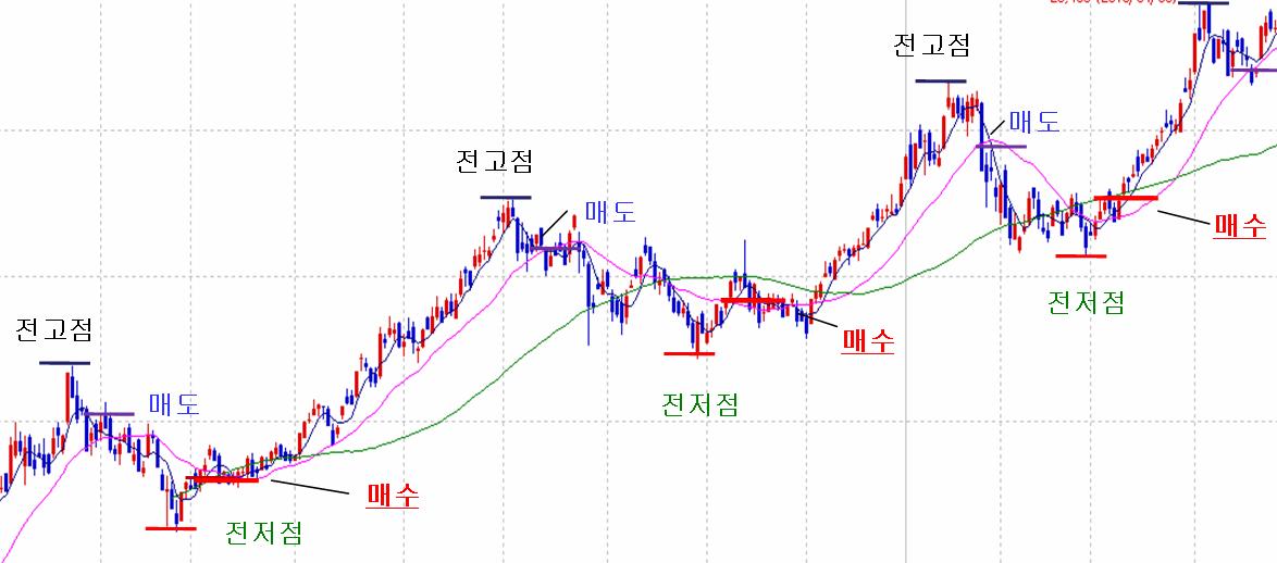그림과 같이 전고점대비 하락 매도, 전저점대비 상승 매수 시스템식 부탁드립니다.