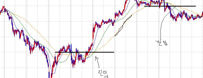 5분봉으로 볼 때 120분 이평선이 위아래로 등락을 거듭하잖아요~