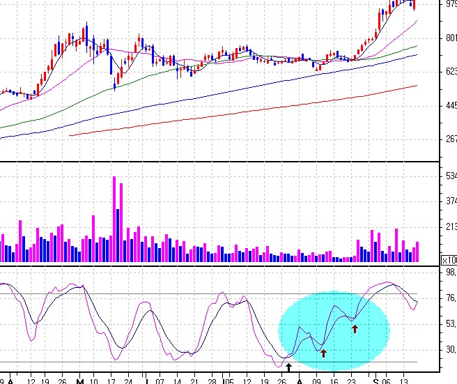 스토캐스틱(10.6.6)의 변수를 가진 지표가 쌍바닥(바닥이 같거나,아니면 저점을 높인)