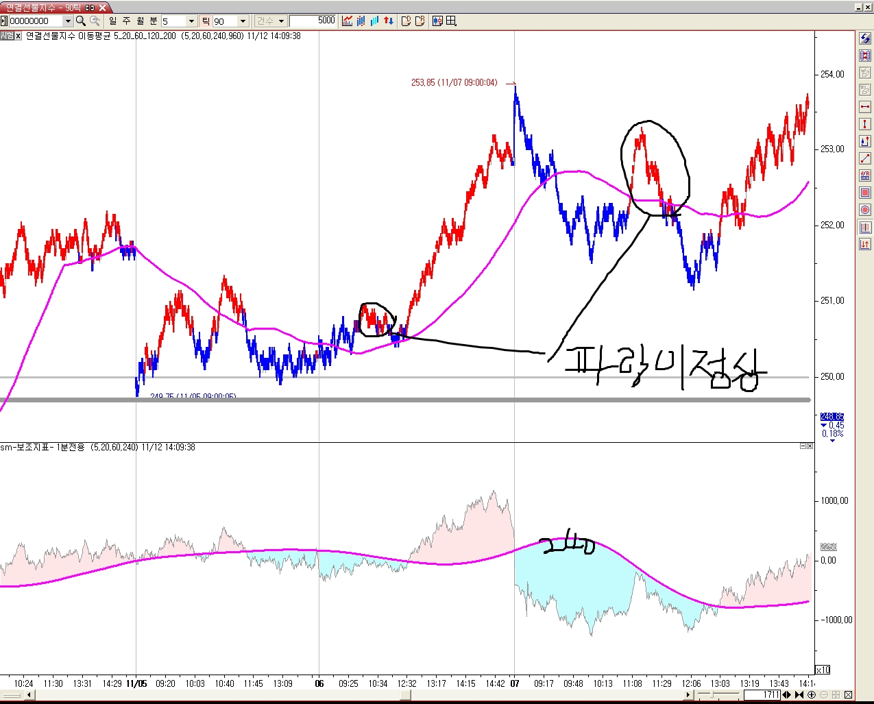 수급보조챠트 그래프에서는 240선 아래인데 선불지수챠트에서는 강조가 빨강으로