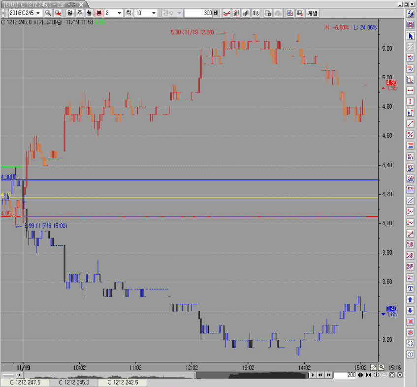 > 그림과 같이 행사가 245 교차차트에서 콜이 당일 시가가 4.05, 풋이 시가가 4.30 일때