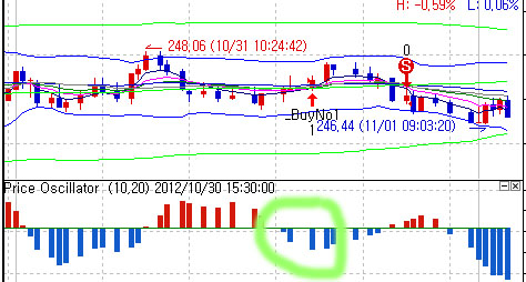 아래그림에서 보면 동그라미 부분에서 PriceOsc가 작아지면