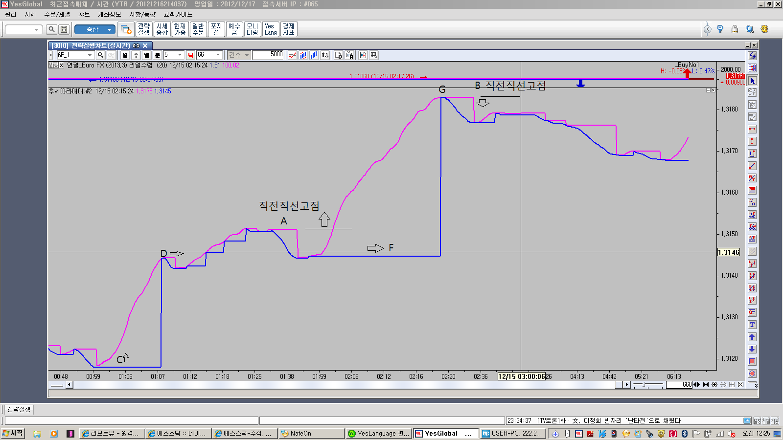 고점돌파후 직선구간을 하향돌파하면 매수청산(분홍색_직전직선고점 B)