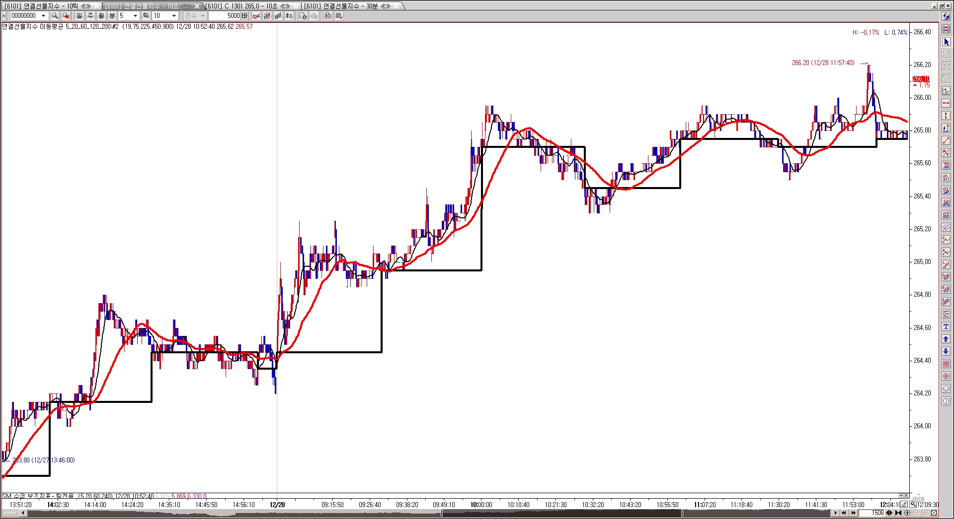 2. 5이평이 30분 스타트지수보다 위 만족시(30분 스타트지수 - 검정 수평선)