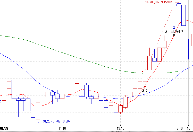두번째는 당일청산시 사이보스에서는 다음분봉 시가에서 청산이 되지만 예스트레이더에서는 다음분봉 종가에서 청산이 되는 것으로 나와서 사이보스에 비해 청산시간이 더 늦은 것으로 나옵니다. 설명부탁드립니다