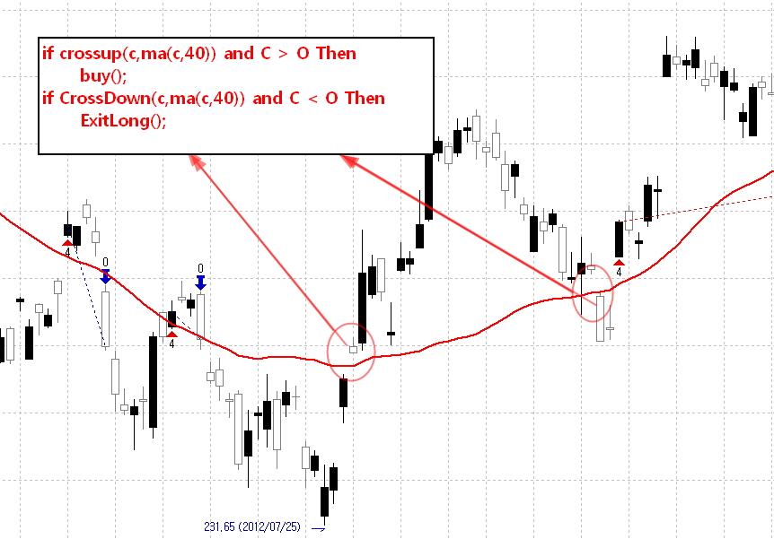 > if crossup(c,ma(c,40)) and C > O Then