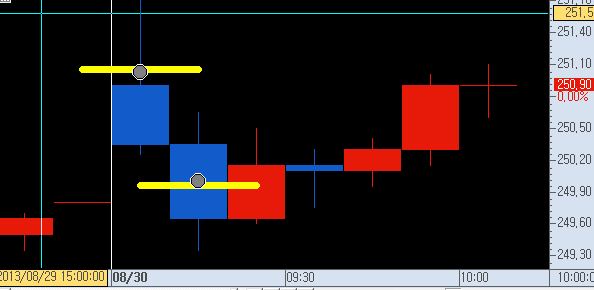 예) 10분봉 종가기준 고가250 저가 248일때 중간값인 249 에 표시를 내고싶은것입니다.