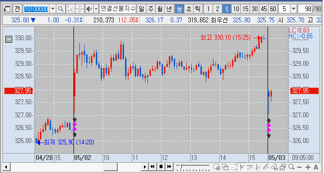 > 선물 120틱 매매 스톡케스틱(26 12 6)로 대응중