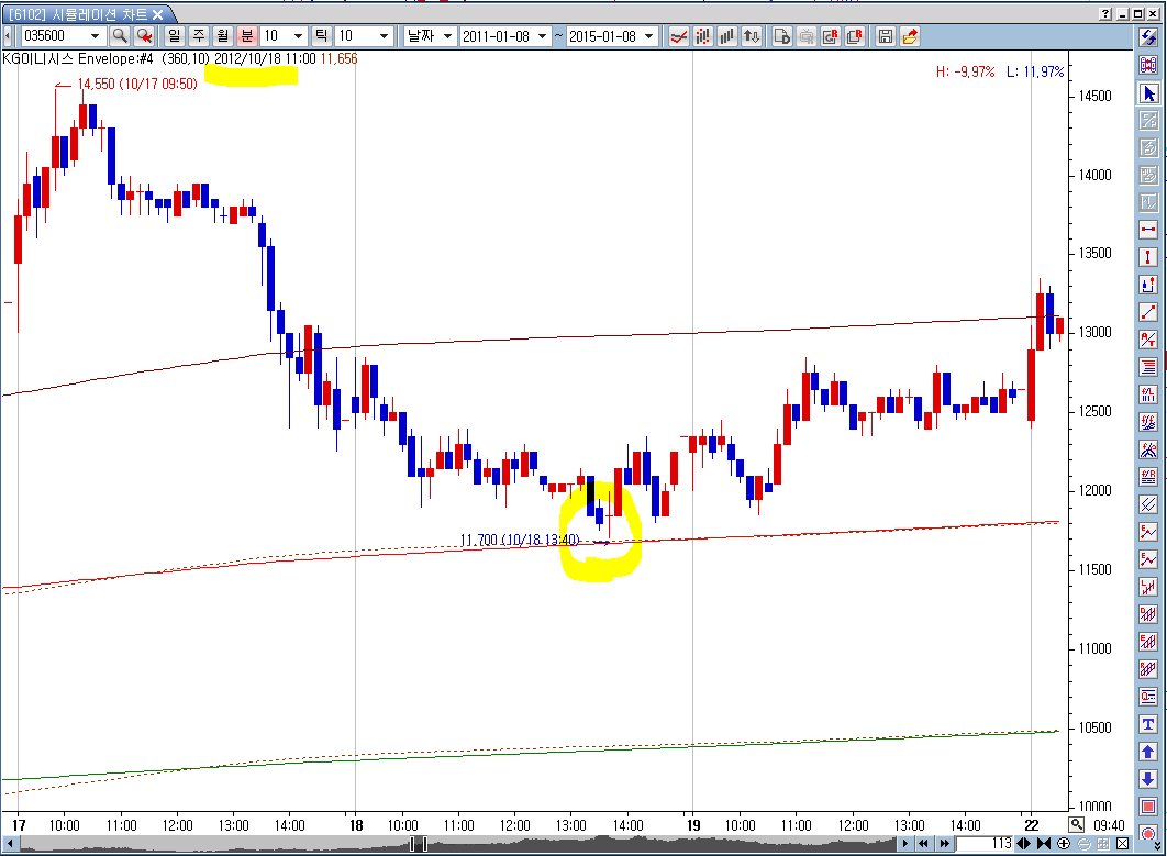 그러면 2012/10/18 일 kg이니시스가 10분봉으로 떠야하는데 안뜹니다.