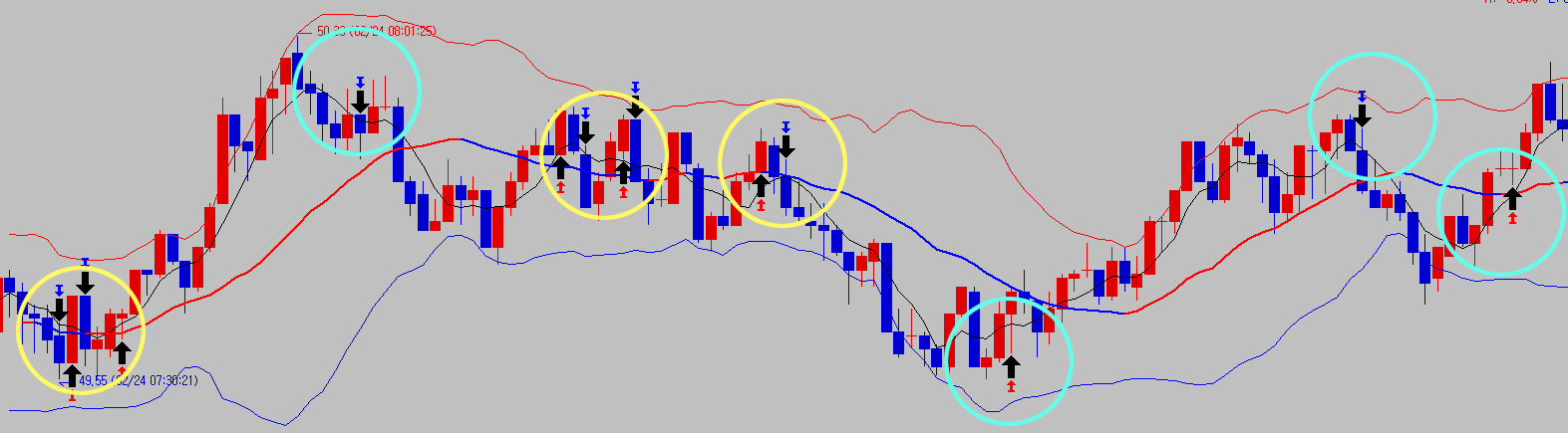 그림에서 노란색 동그라미 부분의 횡보장이나 거래량이 적을때 발생하는 여러개의