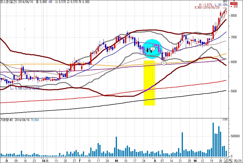 2)일봉 볼린져밴드 60,2(갈색선) 하단보다 이평선 480 600이 더 아래에 있는 종목