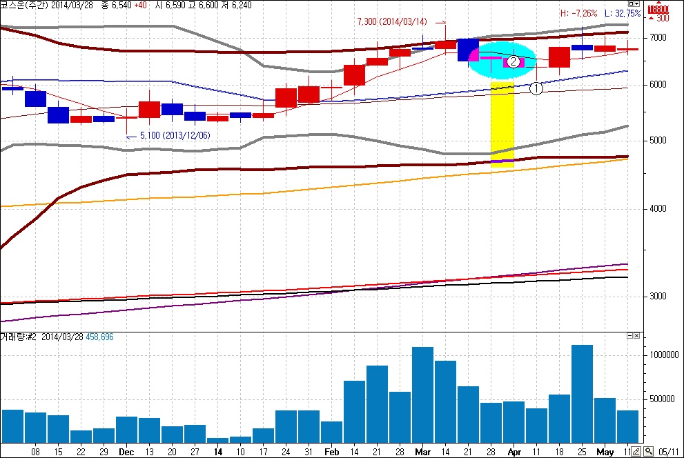 5)주봉 볼린져밴드 60,2(갈색선) 하단보다 이평선 120 240 480 600이 더 아래에 있는 종목