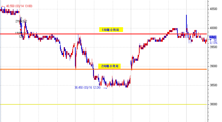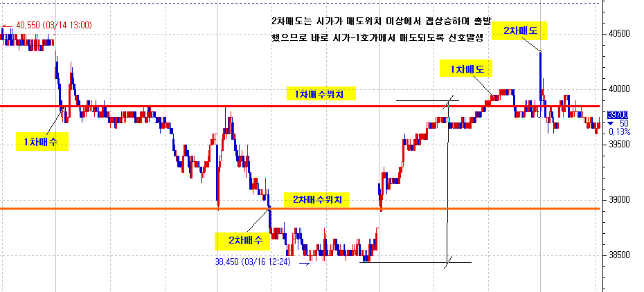 # 시가가 지정한 가격보다 위에서 시작하면 하락해서 지정한 가격 터치시 매수(2차매수1)