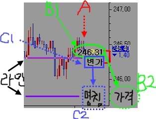 텍스트는 봉의 날자와 시간으로 해당봉에 그리므로