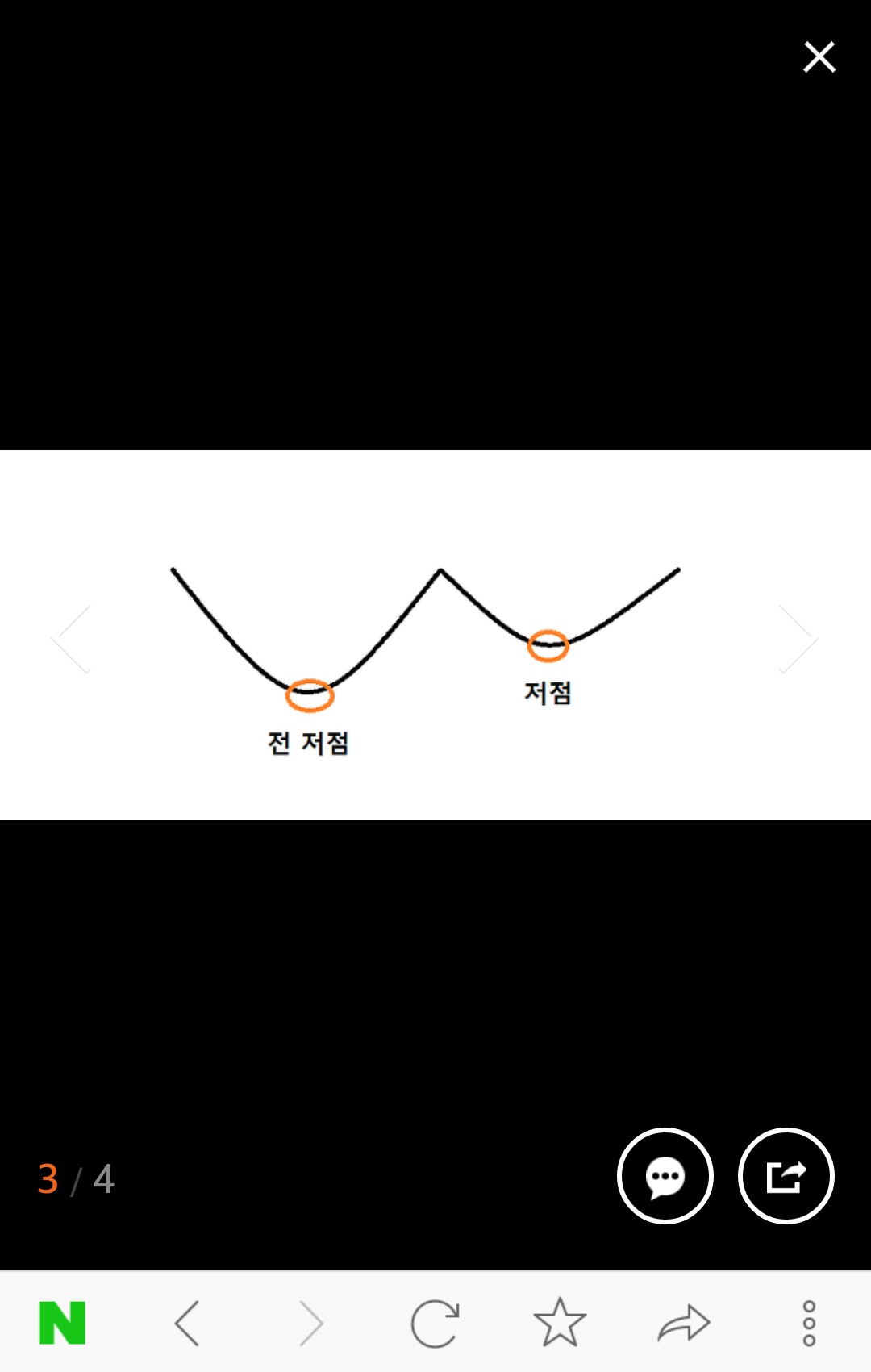 1.그림에서처럼 쌍바닥일 경우, 전 5일선 변곡점 보다 현재 5일선 변곡점이 높아질 때 매수 싸인