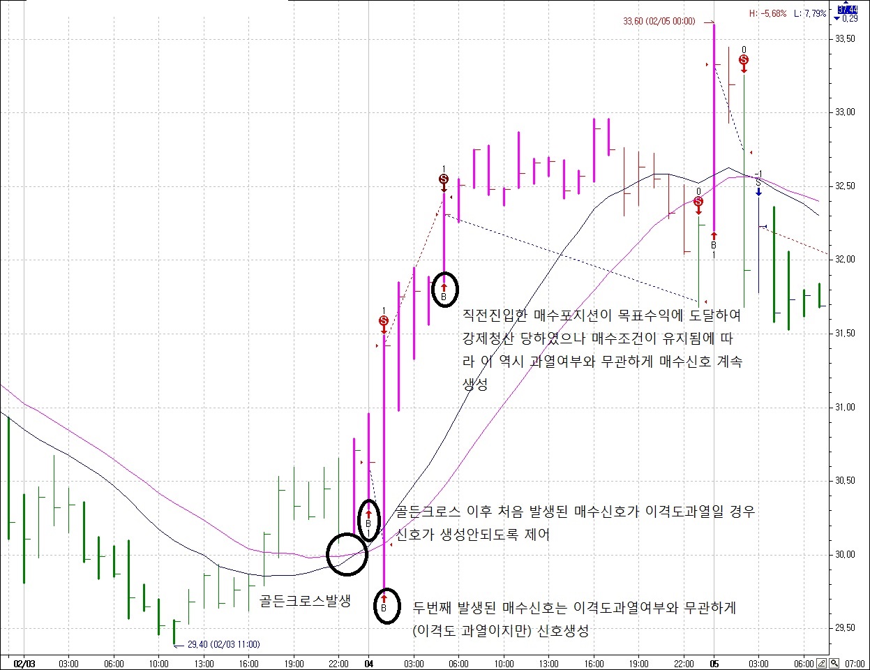 즉 이평선 교차 시점 이후에 처음에만 발생된 신호 지점에 이격을 적용하고 싶습니다.