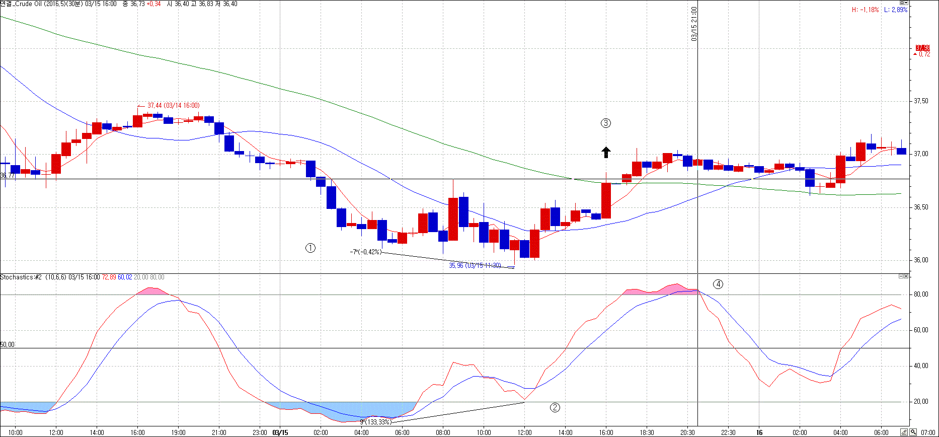조건2.스토케스틱으로 (10,6,6) 에서 K선의 저점이 상승(이때 양 저점 모두 스토상 50 미만) 하는 (상승 쌍바닥) 이면서