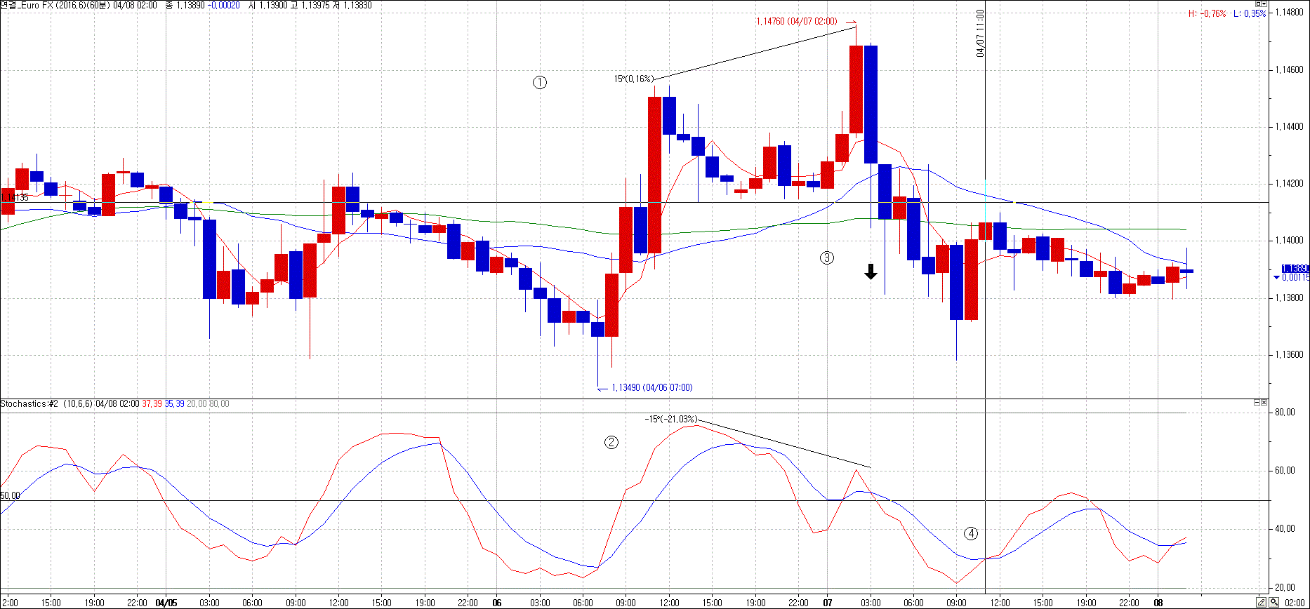 조건2.케스틱으로 (10,6,6) 에서 K선의 고점이 하락(이때 양 고점 모두 스토상 50 이상)으로 (하락 쌍봉) 이면서