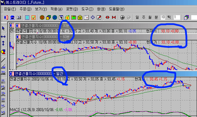 주간과 일간, 분간에서 각각 현재가가 달리하고 있습니다.