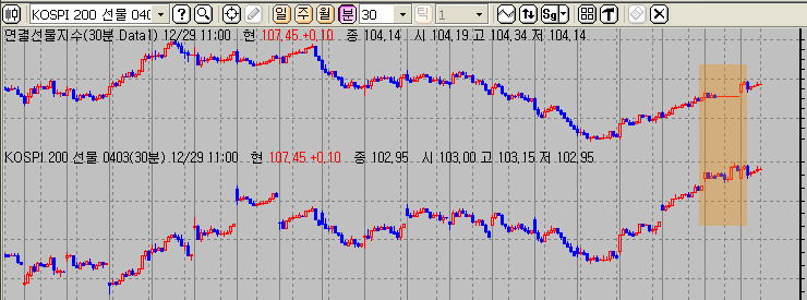 그림에서 보시는 바와같이 일간 갭을 보정한 차트에서는 봉이 나타나지 않습니다.