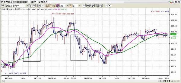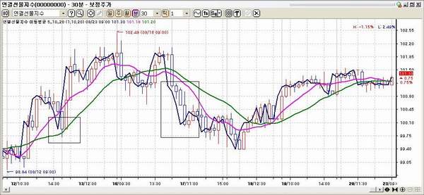 그러나, 보조챠트인 이동평균선은 좌측으로 1틱 밀린상태로 이어집니다.