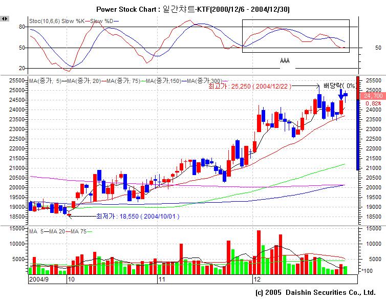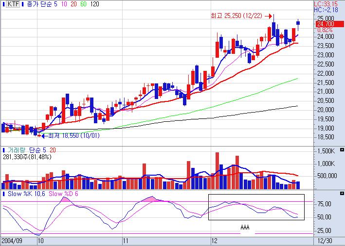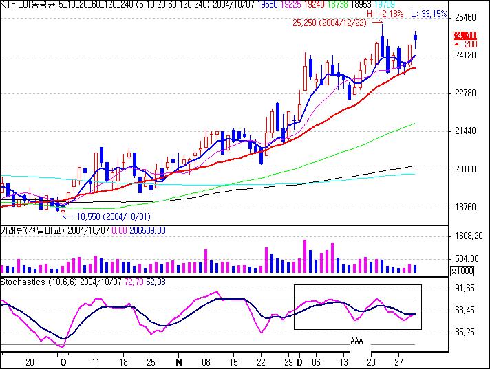 'KTF' 라는 종목에 스토캐스틱 슬로우 10-6-6을 적용해서 보는데