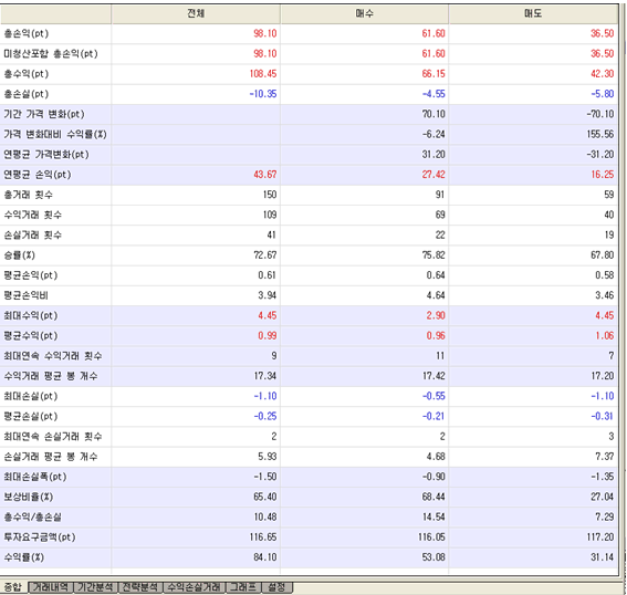 첨부된 시스템의 평균손익(=총손익/총거래횟수)을 계산하면 전체, 매수, 매도에 대해 각각 0.65, 0.68, 0.62로 계산되어 시스템성능 보고서의 결과와 다르게 나타납니다. 왜 그럴까요?