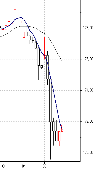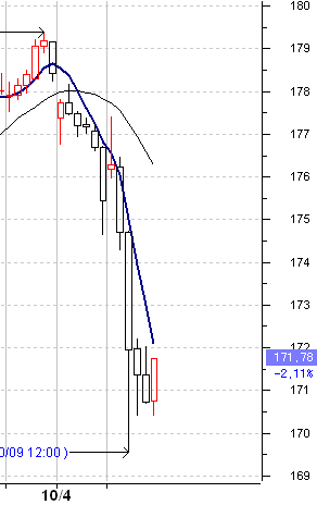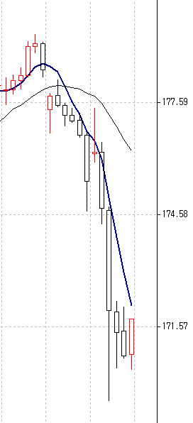 다른 증권사의 차트에서는 똑같은 환경설정에서 5 이평선을 하락해 있습니다.