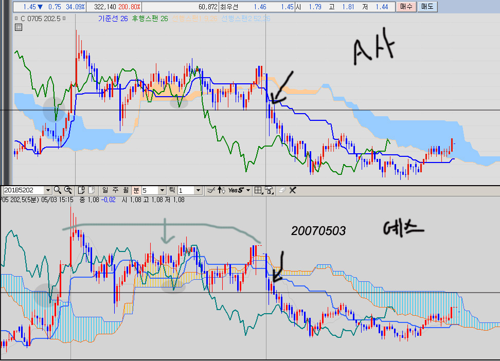 두 개의 차트에서 차이가 있다면 A사에서는 3시 이후 3시 5분과 10분의 봉은 없습니다. 그러나 일목균형표에서 선형스팬은 최고, 최저 가격을 참고하기에 금일 종가만 필요하고 3시 이후 봉은 넣지 않아도 상관이 없는 것으로 알고 있습니다. 다만 후행스팬의 움직임이 금일 봉 26개 움직임 이전에 두 개의 봉간격에서 앞으로 당겨지는 것으로 드러납니다.