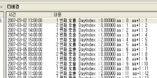 2007-03-05 11:00:00 1 번째 호출 DayIndex : 2.000000 aa : 10 aa+1 : 11