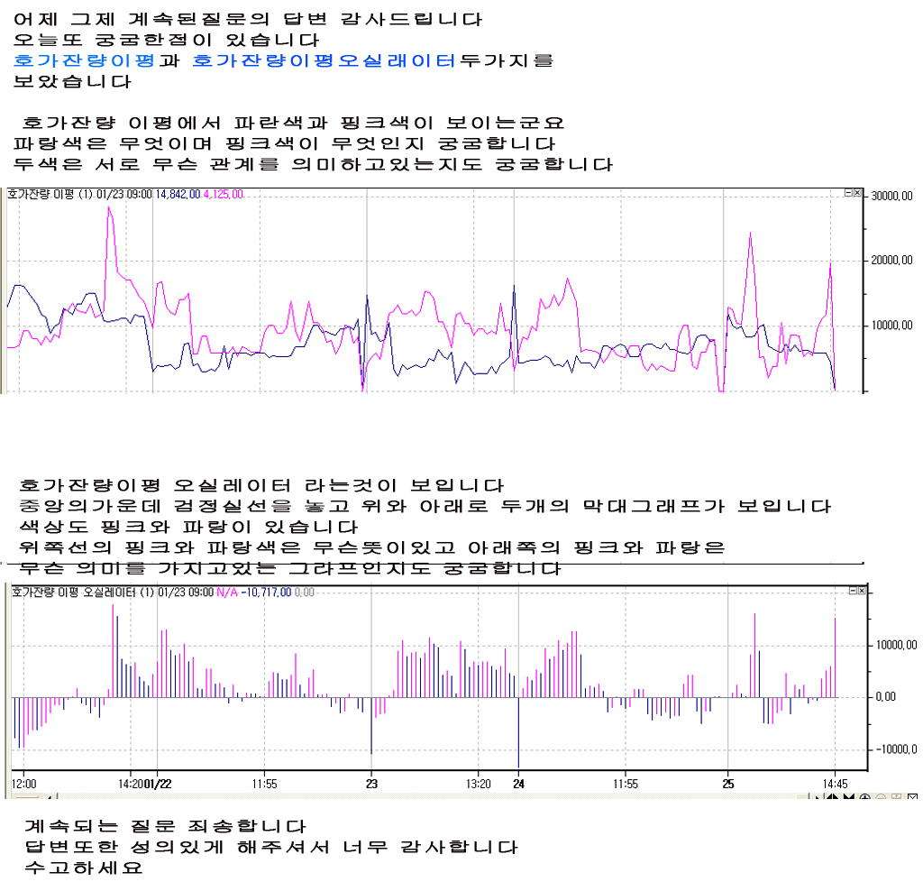 호가잔량이평의 핑크색은 매수호가총잔량 이며, 파란색은 매도호가총잔량을 나타냅니다. 호가잔량이평 오실레이터는 매수호가총잔량에서 매도총호가잔량을 차감한 값을 나타내는데, 핑크색은 전봉보다 값이 상승했을경우이며, 파란색은 전봉보다 값이 하락했을때 입니다.