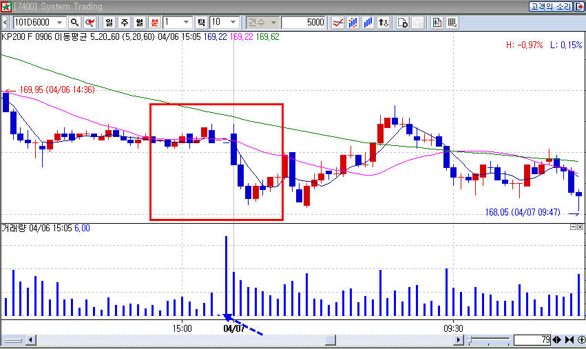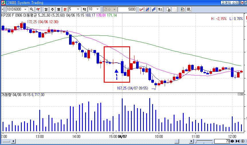5분봉 차트에서 15시 이후 봉이 2개만 존재해야 되는데 3개가 됩니다. 이렇게 되면 이평이 늘어나게 되고 전봉 참조가 틀려질수 있습니다.
