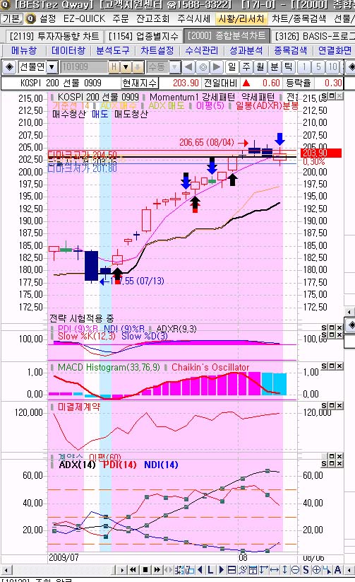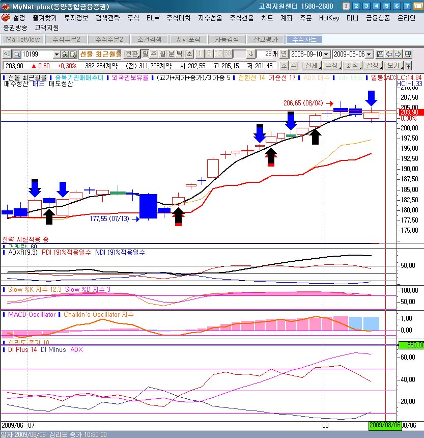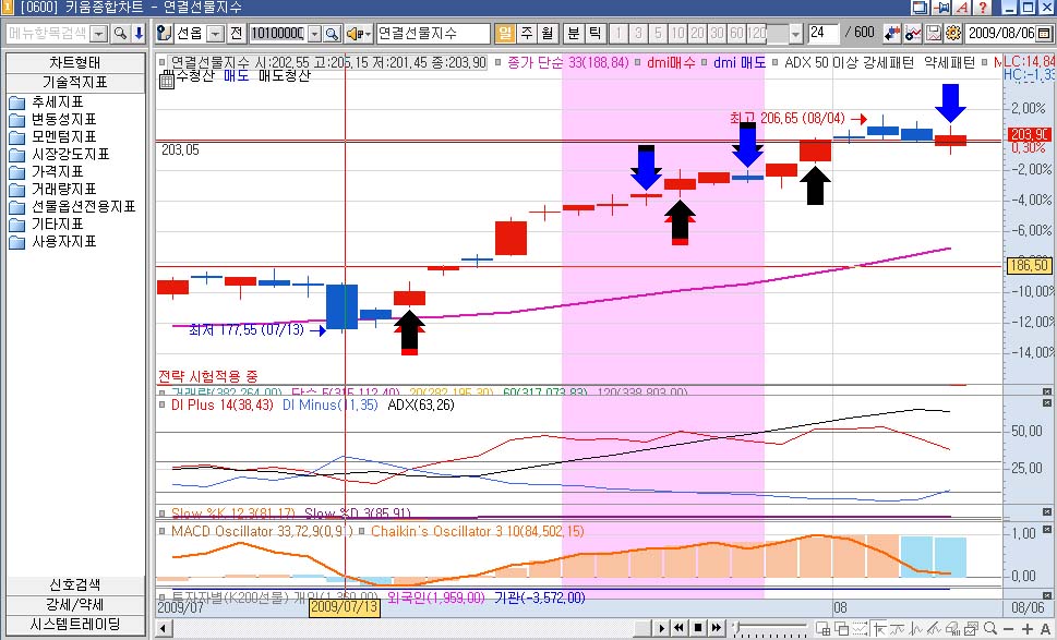 보시면 아시것지만..오늘날짜로 DIPLUS(38.43),DIMINUS(11.35),ADX(63.26)값으로