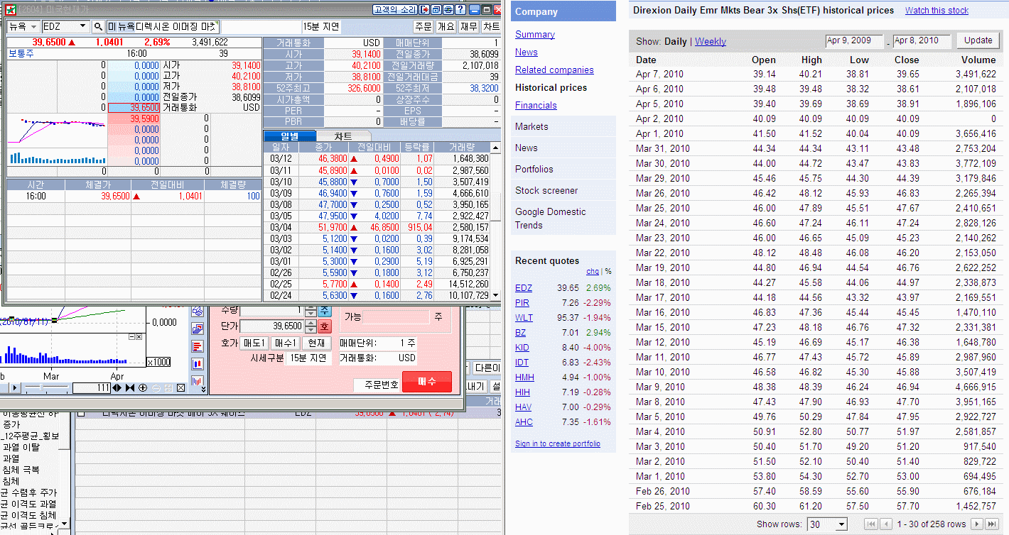 액면병합 비슷한게 일어난것 같네요. (첨부의 오른쪽 화면이 구글 파이낸스에서 EDZ 주가입니다. 여긴수정주가 처리가 되서 나옵니다.)