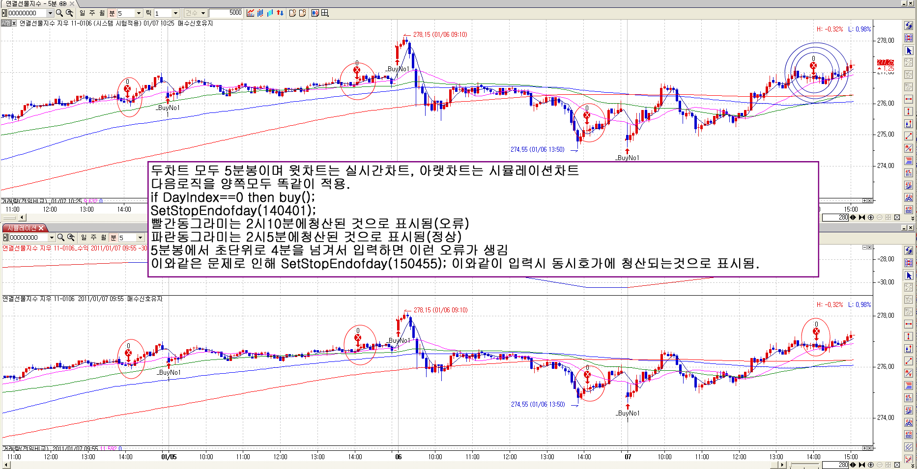 말씀하신 내용은 시뮬레이션과 실매매에서 차이가 나는 경우인데(전문가마당 게시판 글을 참고하시면 좀더 자세한 내용이 있습니다.), 시뮬레이션데이터가 초단위의 데이터를 가지고 있지 않기 때문에 4분 이후의 초데이터를 인식할 수 없어서 발생되는 현상입니다.