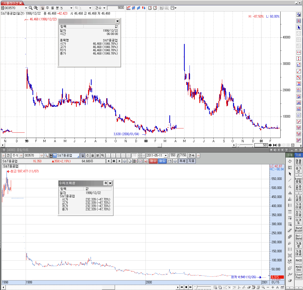 보시다시피 98년12월22일 양상이 천지차이입니다. 아랫쪽은 반토막이 났구요. 위쪽은 열배이상 올랐는데요.