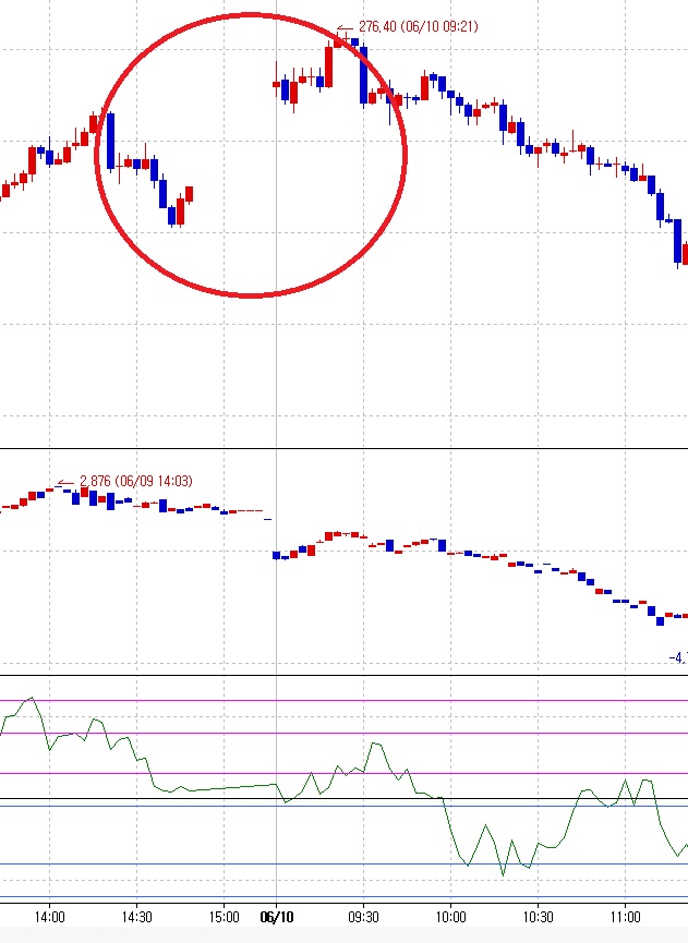 그렇게 되면 챠트에서는 6월9일 2시50분이후부터 다음날 장 시작까지는 공백이 되게 됩니다.(그림1)