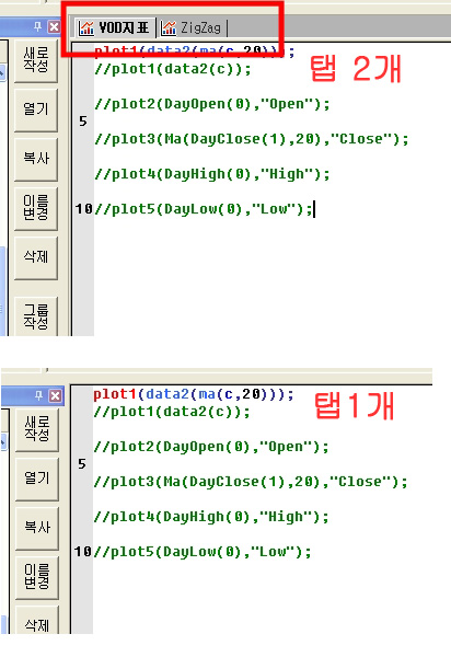 > 예스랭귀지 편집기의 코드창에서 지표가 2개 이상 열려 있으면 탭버튼이 생기는데,