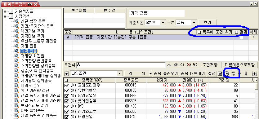 4) "파워종목검색"에서는 "매수총잔량" 등 모든 필드를 클릭해서 정렬시킬 수가 있는데, "종목검색"에서는 "매수총잔량" 등 몇개 필드는 정렬이 안됩니다.