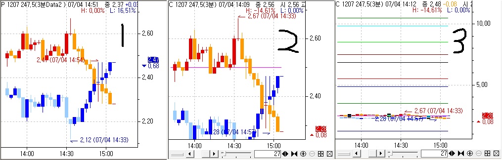 3번 그림처럼 콜과 풋 차트가 아래로 나오는 현상은 가격과 지표가 모두 같은 Y축에서 표시되기 때문이므로 별다른 방법은 없고 콜이나 풋의 가격과는 현저히 차이가 나는 선차트를 삭제해서 표현하는 방법 밖에 없습니다.