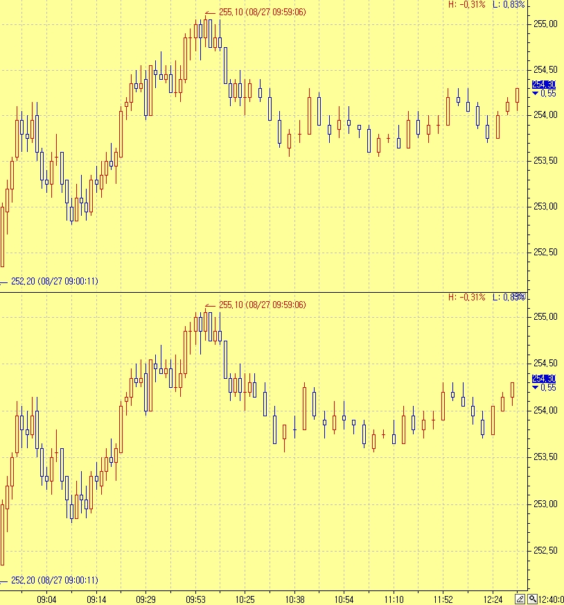 500틱 선물차트에 동일한 500틱차트를 보조차트로 띄웠습니다.