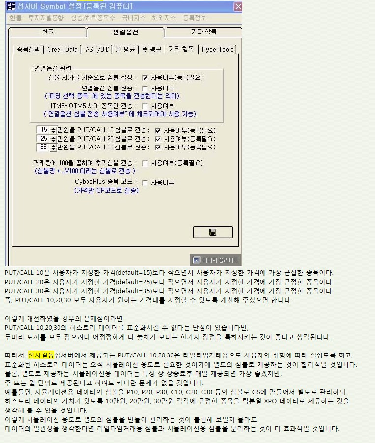 향후 타종목주문화면(예를 들어 선물 신호를 받아서 옵션 주문을 내는)이 서비스될 예정인데 이 화면을 제공하면서 말씀하신 데이터 제공에 대해서 더 검토해 보도록 하겠습니다.