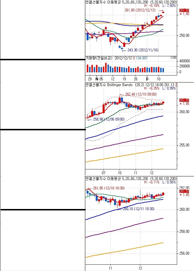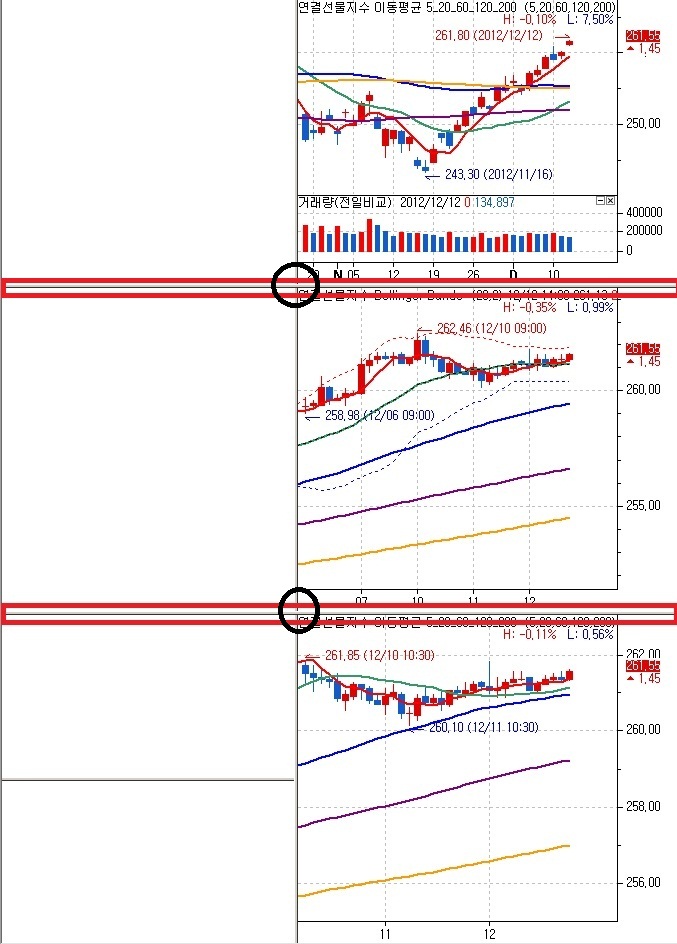 새차트 아이콘을 클릭해서 화면을 세로로 분할해 놓으시고 세번째 분할된 차트부터 1번차트와 2번 차트 아래쪽으로 이동시켜서 배치시켜주면 됩니다.