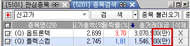 > 제목 : 관심종목[5101], 종목검색[5102]에서 총거래대금 항목