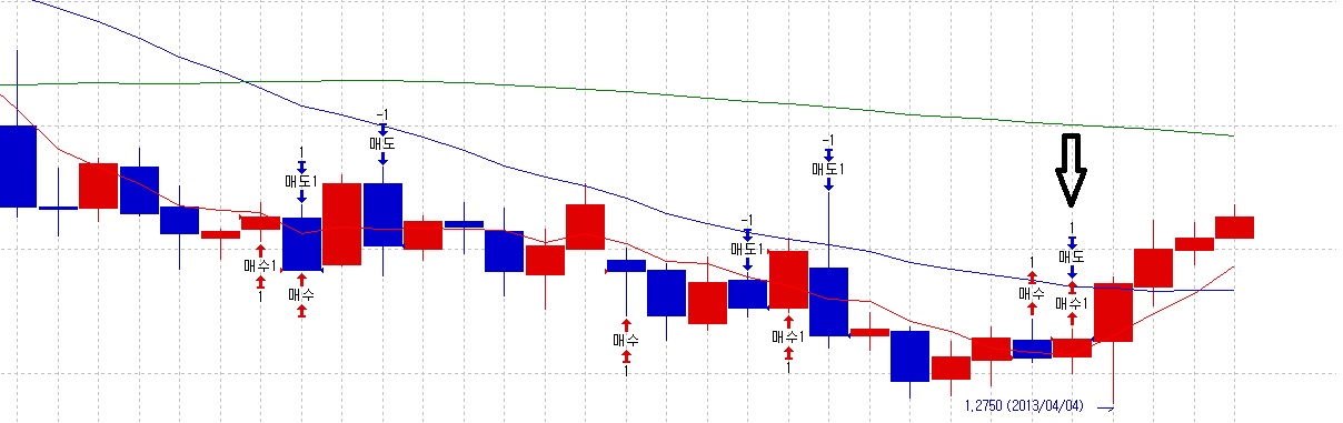 1계약으로 매매할 경우 실제 주문을 낸다면 매수2계약과 매도2계약이 동시에 주문 들어가게 됩니다. 만일 증거금이 충분하고 신호대로 주문이 모두 이루어졌다면 최종적으로 매수1계약을 보유하게 됩니다.