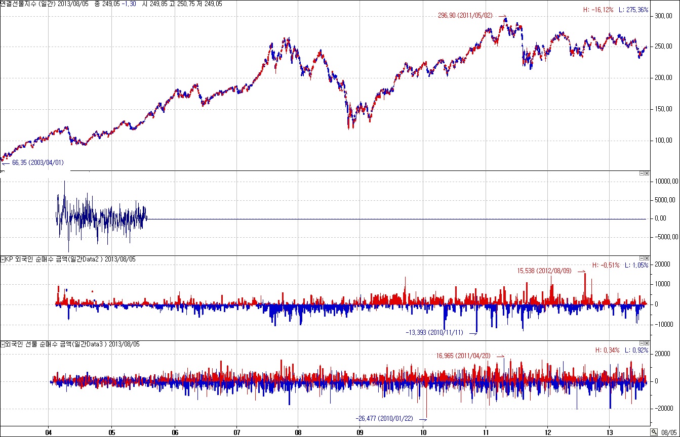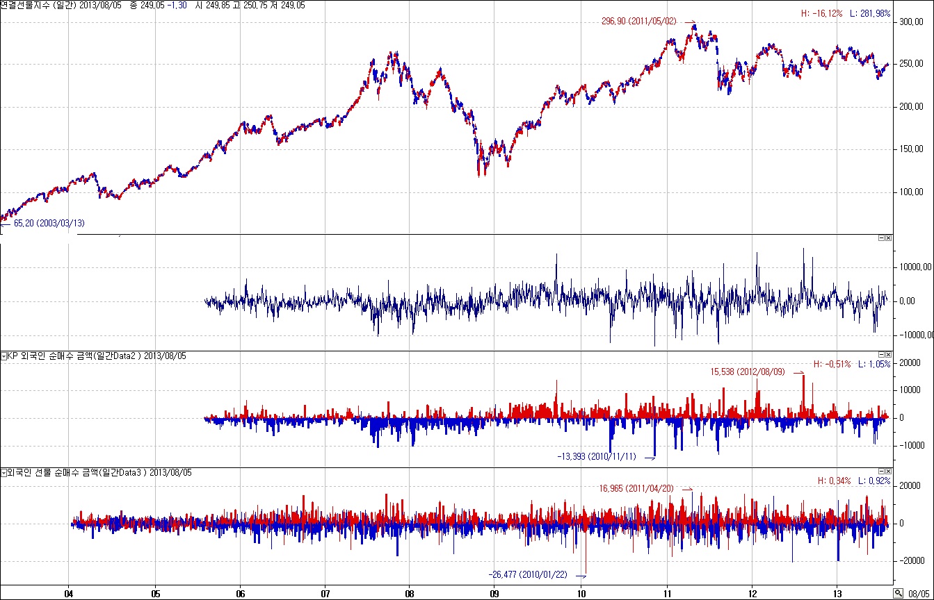 그리고 두번째 그림을 보시면 같은 것을 KP외국인 순매수 금액의 조회기간을 문제가 되었던 2005년 8월 3일부터 조회하면 그 이후에 제대로 잘나옵니다.