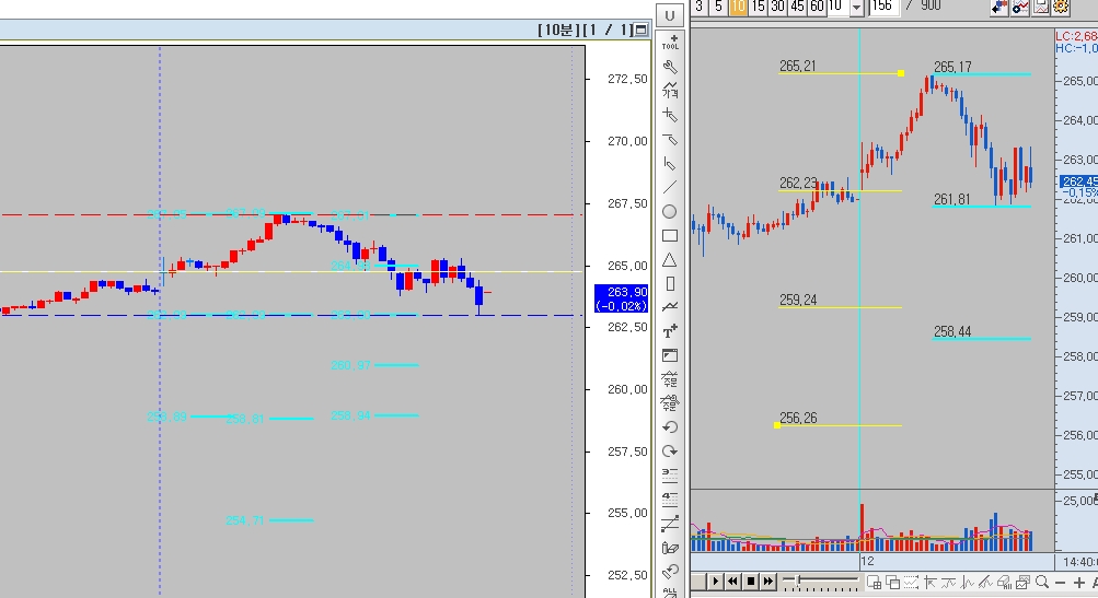 한투와 키움에서 분봉상 당일 고점과 저점으로 4등분선과 3등분선을 그어놓은겁니다.